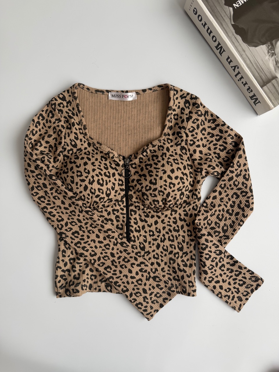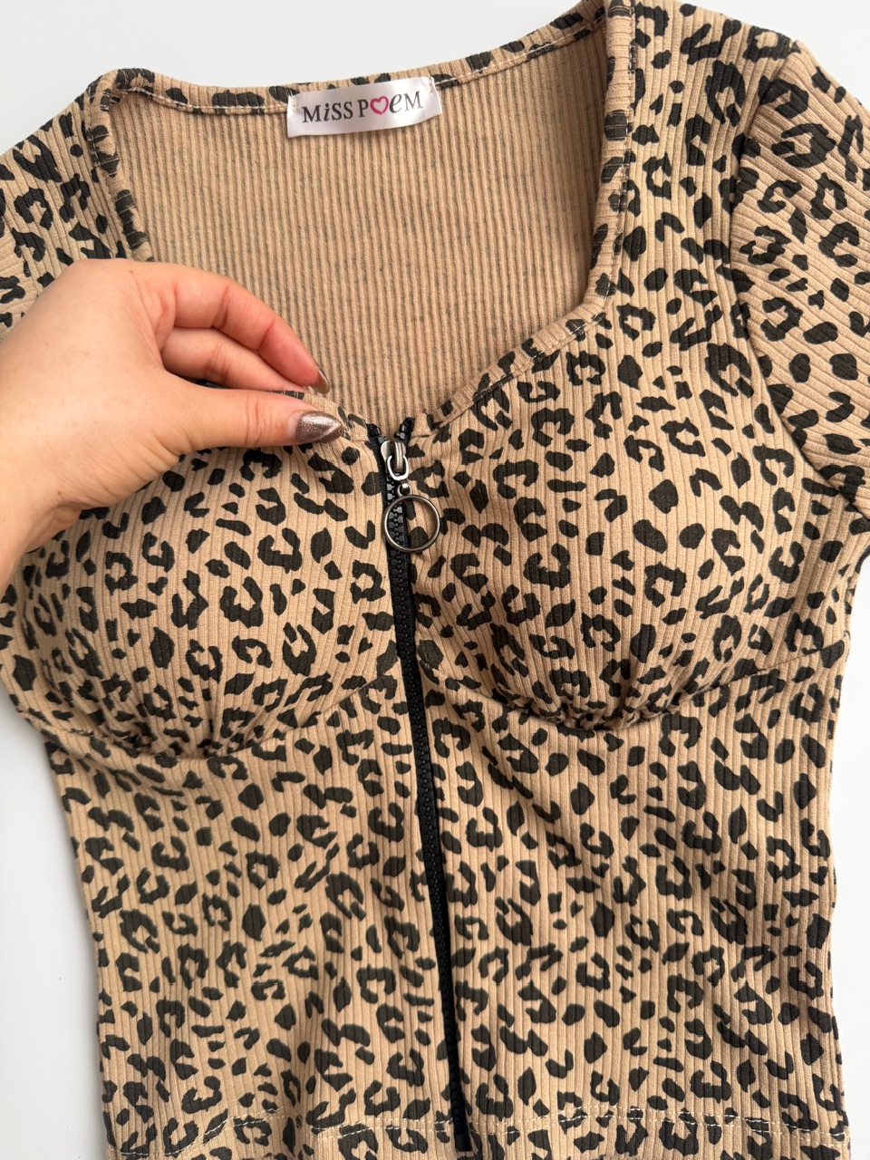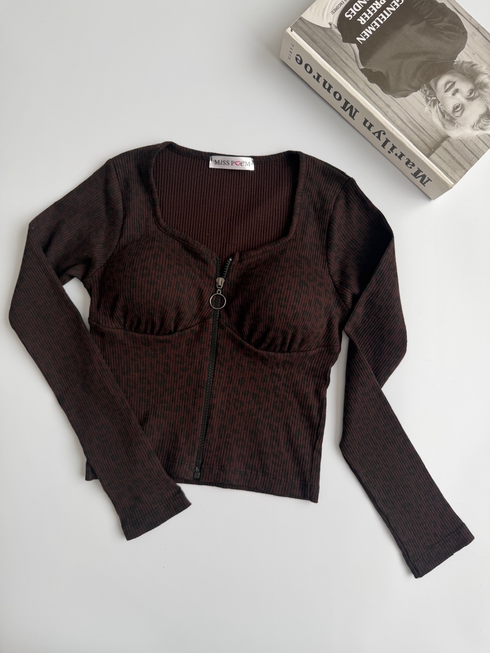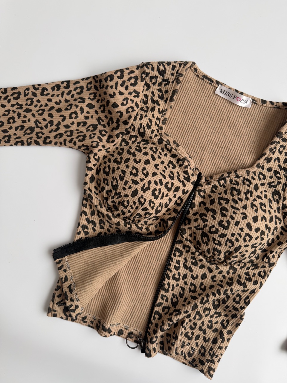 کراپ کبریتی جلو زیپ دار استین بلند/پلنگی